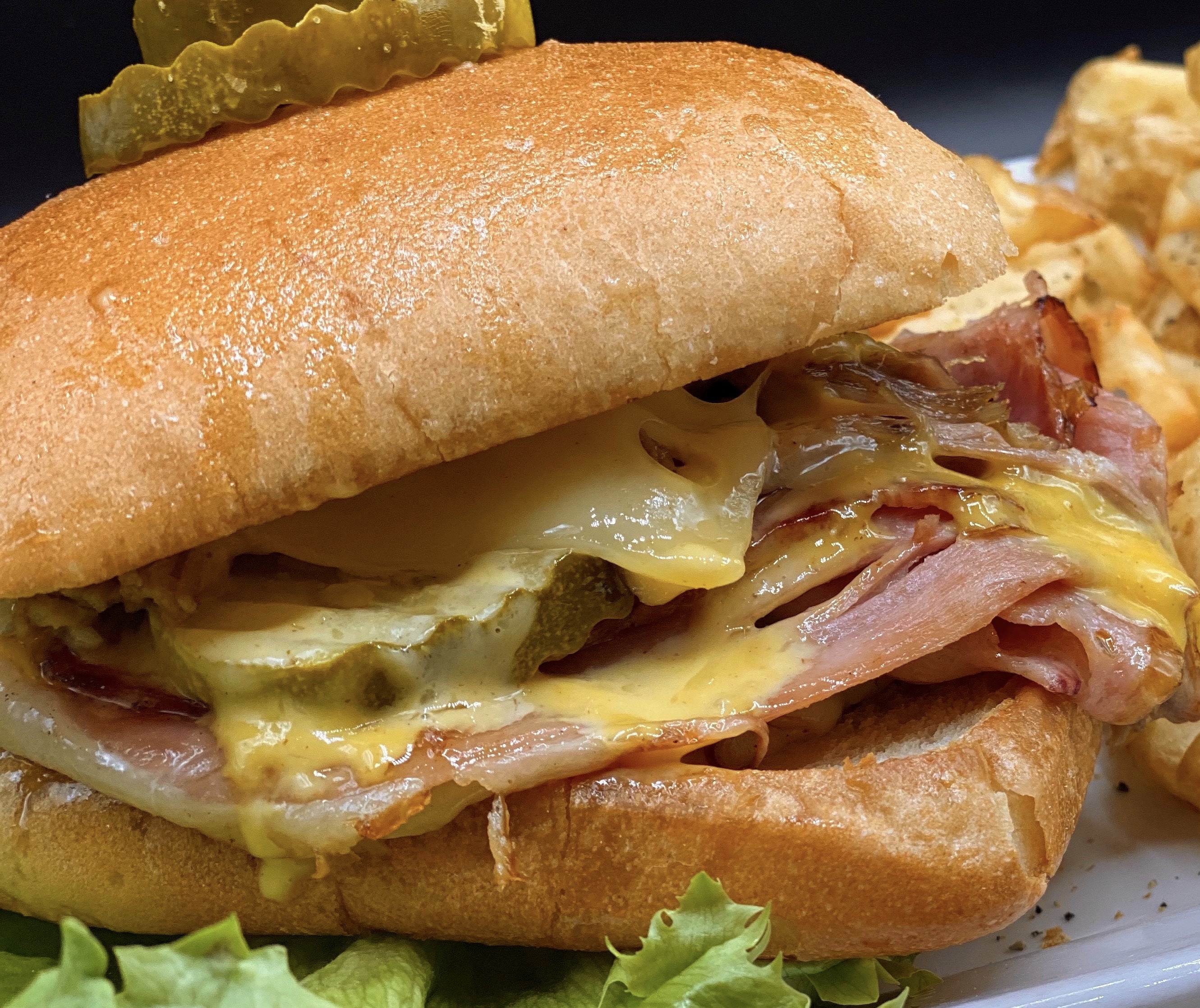 Putters Housemade Blend of Beef & Pork Burger, Smoked Pulled Pork, Sliced HamPickles, Swiss Cheese, Spicy Mustard, Ciabatta Bun Served with Waffle Fries. Está Volao!